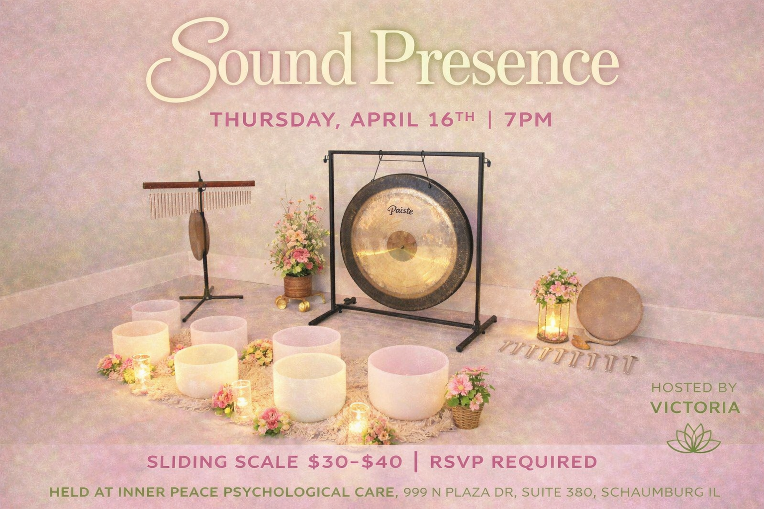 Sound Presence April Sound Bath 4/16/2026 7 pm 999 N. Plaza Dr., Suite 380, Schaumburg, IL 60173 Link to register:Â https://square.link/u/bRwCQFV8